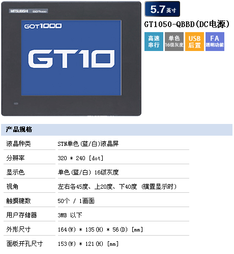 GT1050-QBBD-C | 5.7寸QVGA,STN蓝白16灰度,直流24V供电,带232/422接口,USB下载 |