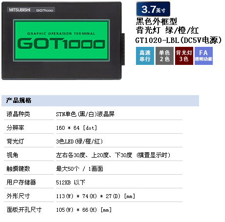 GT1020-LBL-C | 3.7寸,STN蓝白单色,从PLC编程口供电,RS-232下载 |